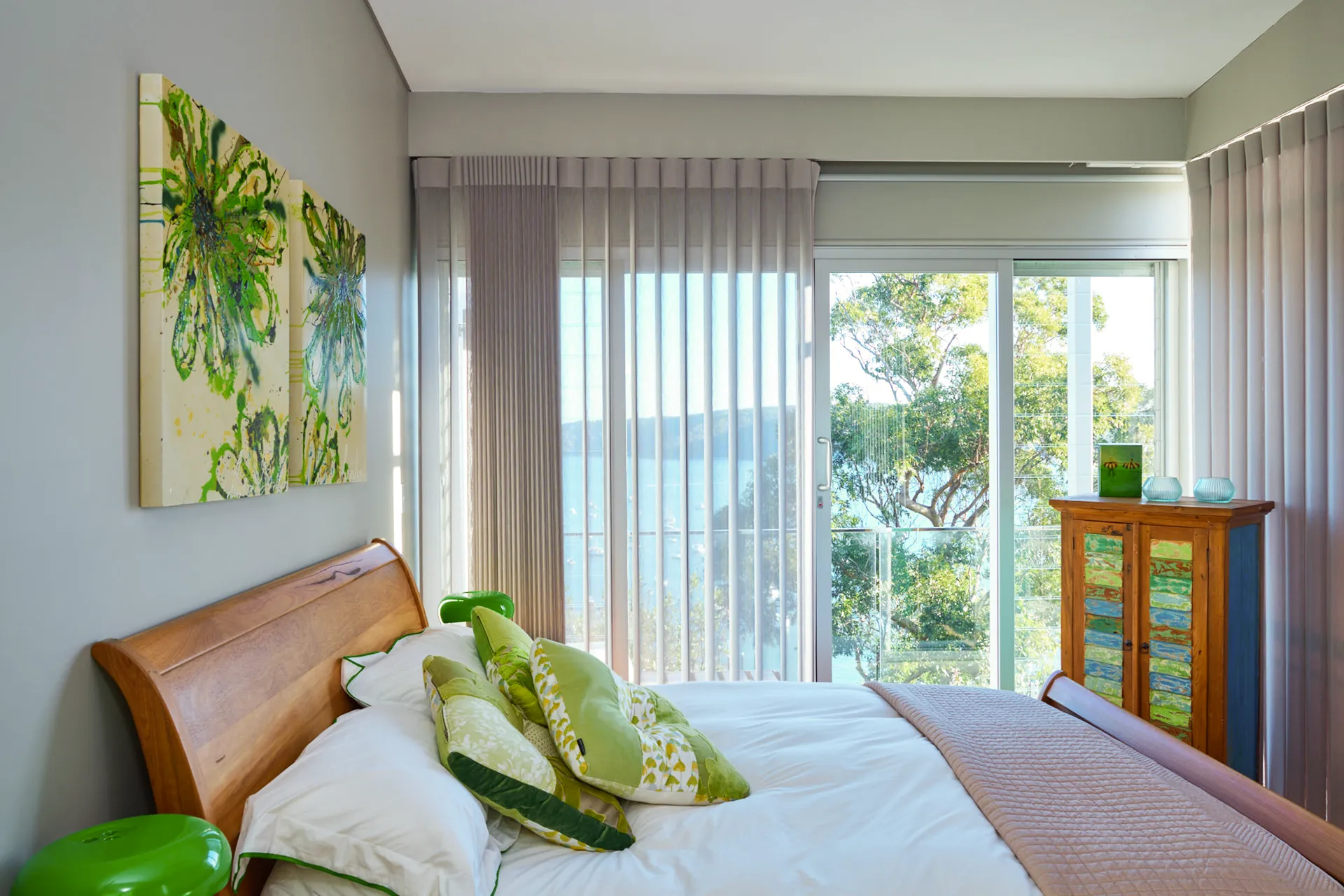 The soft fabric hangs beautifully. There are no weights or chains so you can walk through them anywhere, whether they’re opened or closed – they just sway out of the way and settle back perfectly. This makes them perfect for creating a soft feature across a large opening. Veri Shades can span up to six metres.